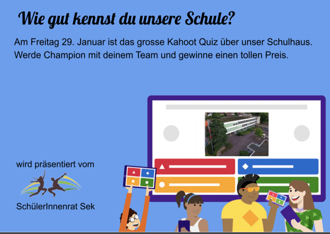 Und schon wieder versuchen wir das Beste aus der Situation zu machen: Der SchülerInnenrat hat ein Schulhaus-Quiz vorbereitet, das zum Semesterschluss gleichzeitig in allen Klassen durchgeführt wird.