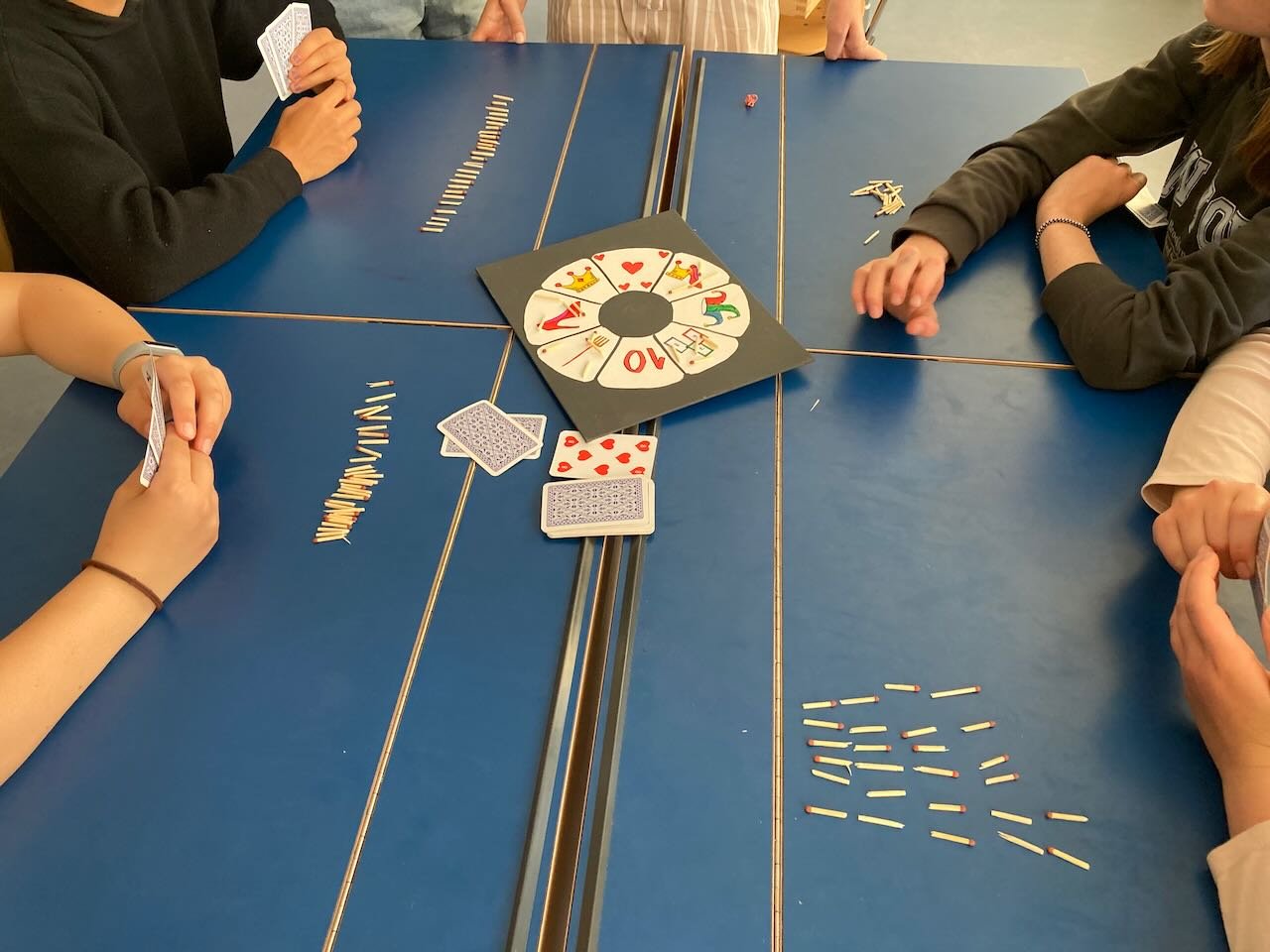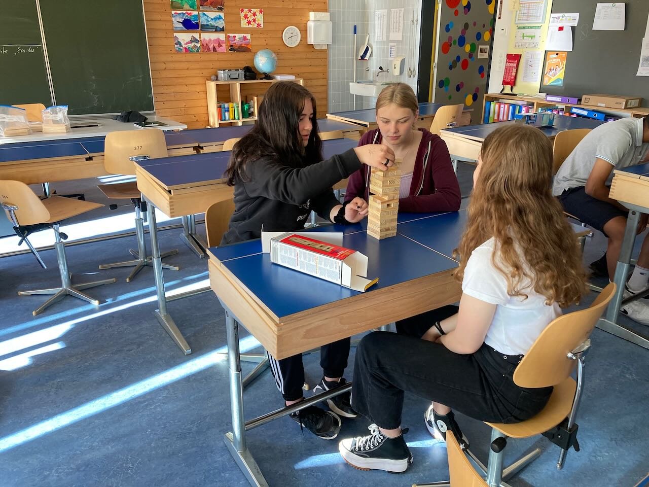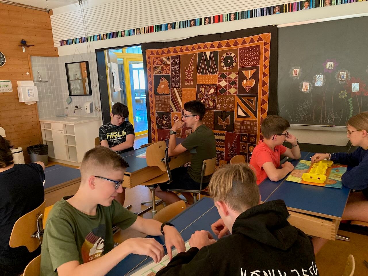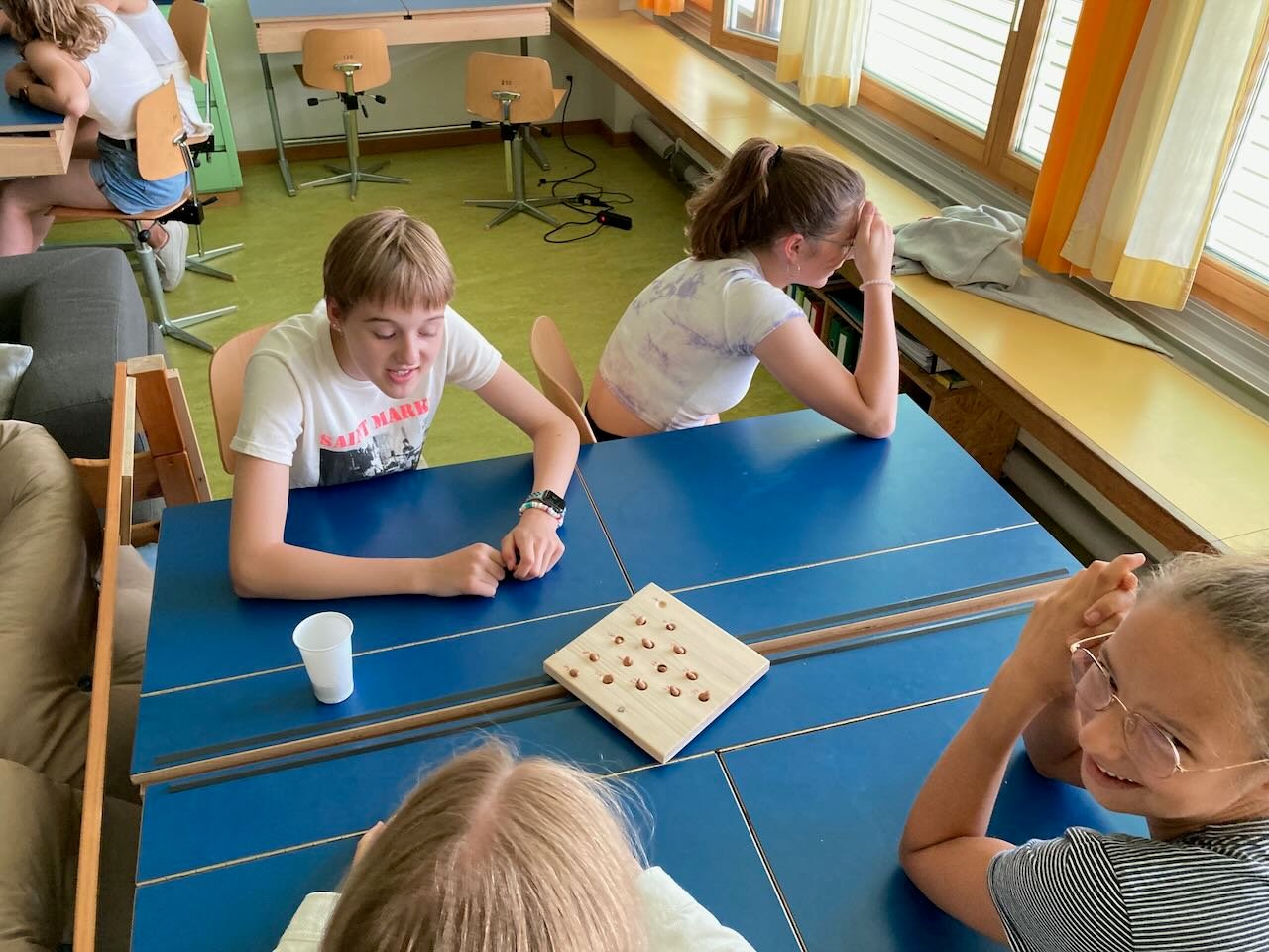 An der Sekundarschule Langnau galt für einen Tag das Motto "Spiele aus aller Welt". Alle Schüler*innen konnten über den Tag verteilt sechs verschiedene Spiele (Brettspiele, Ballspiele, Kartenspiele, Geschicklichkeitsspiele, Knobelspiele, usw.) ausprobieren und spielen.