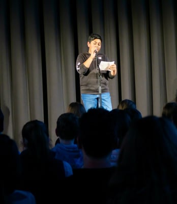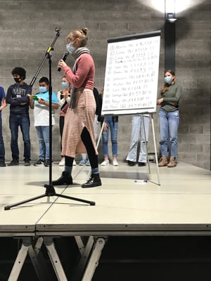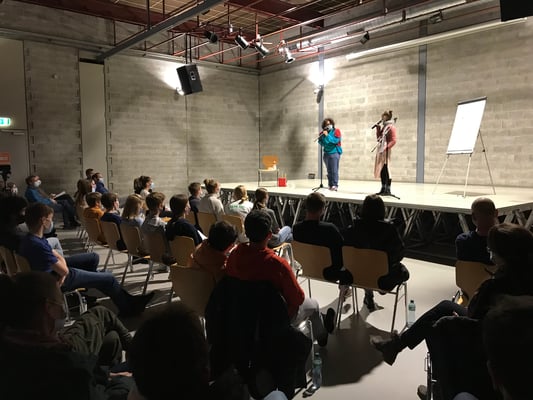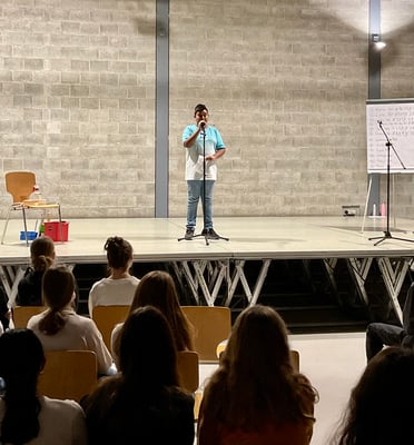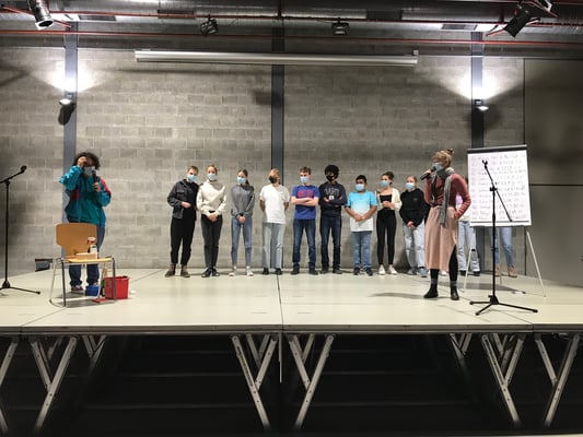 Unser internes Schulfinale im Slam@School-Wettbewerb 2021-22 in der Kupferschmiede Langnau begann mit einem negativen Paukenschlag: Unser preisgekrönter Projektleiter Valerio Moser, der den Abend moderieren sollte, lag mit Omikron zuhause in Langnau im Bett. Dafür standen seine Co-Leiterin Sarah Altenaichinger und Valerio-Ersatz Kay Neuenschwander auf der Bühne und führten souverän durch den Wettbewerb. Und der hatte es in sich: Bereits die ersten Poet*innen kriegten vom geladenen Publikum, welches heuer aus den Eltern der beiden Klassen und Ehrengast Martin Lehmann, dem Kulturchef im Langnauer Gemeinderat bestand, hohe Wertungen und setzten ihre Nachfolger*innen unter Druck. Das Niveau der Texte und Darbietungen blieb aber hoch bis zum hoch, so dass Moderatorin Sarah es bedauerte, dass sich auch heuer nur zwei Kandidat*innen für das Berner Finale qualifizieren konnten.