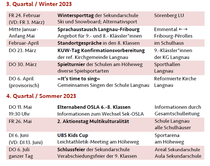 Die aktuellen Termine sind auf unserer Website www.seklangnau.ch aufgeschaltet. Jeweils ganz unten finden Sie die aktuellen Wochentermine.